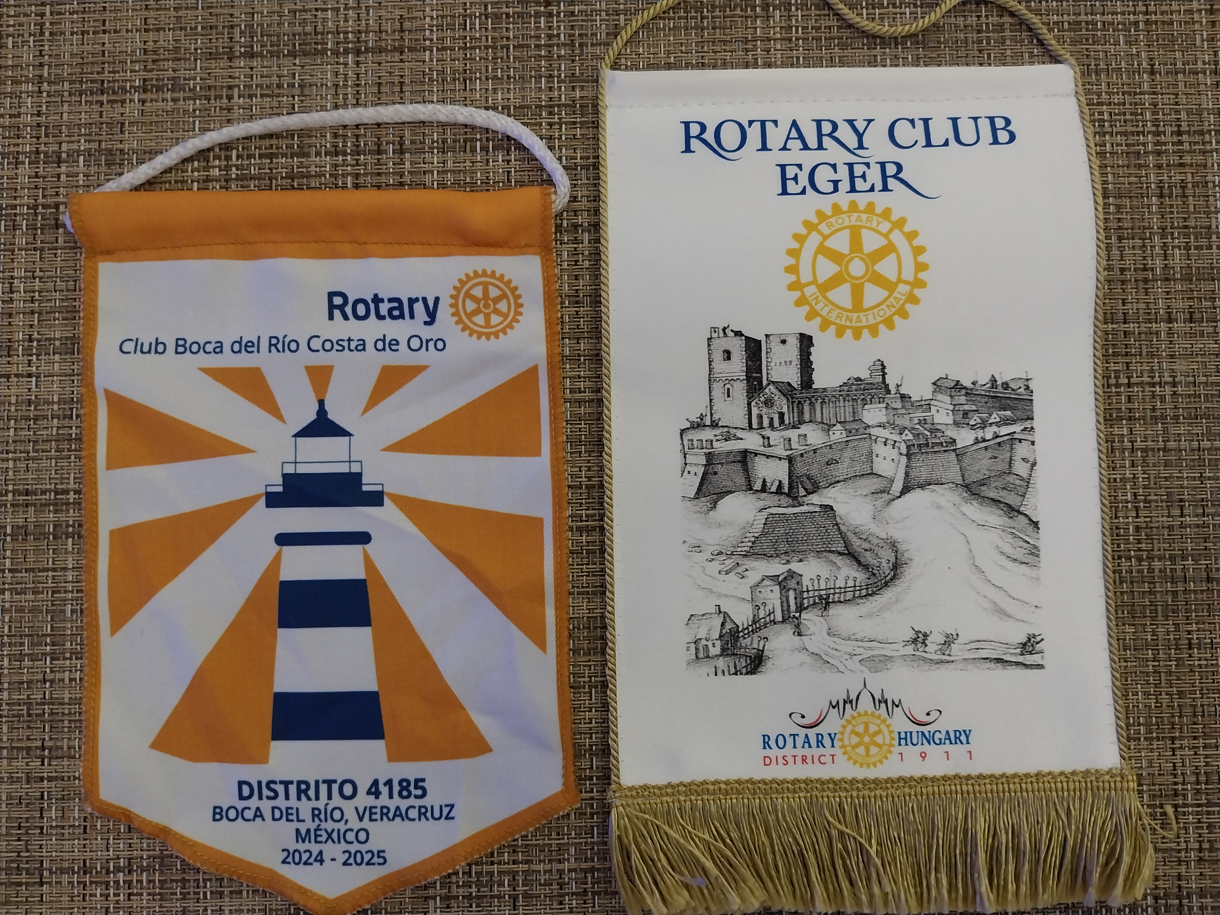 A kedves vendégeket Dr. Nagy Márton elnök köszöntötte, aki egy meghívást adott át Gaby részére, a klubunk valamennyi rendezvényére. Ezt követően a zászlócsere is megtötént és apró mexikói ajándékot is kaptunk.